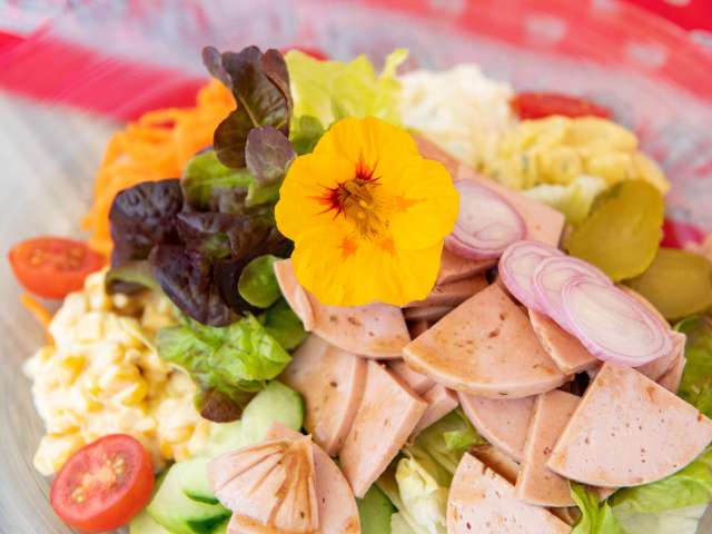 Anschliessend steht ein Winter-Salat und ein reichhaltiges Fondue Chinoise mit einheimischem Fleisch vom Rind, Schwein und Poulet, frischen Früchten und hausgemachten Saucen auf der Menu-Karte.