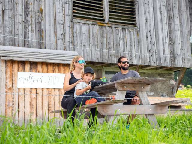 Das Mullerä-Beizli beinhaltet eine gemütliche Sitzgelegenheit sowie zwei Gastrokühlschränke. Sie sind gefüllt mit Getränken und Snacks wie beispielsweise feinen Kuchen und Zutaten fürs Plättli. Das Angebot basiert auf Selbstbedienung und ist für Wanderer, Biker und Tagestouristen frei zugänglich.