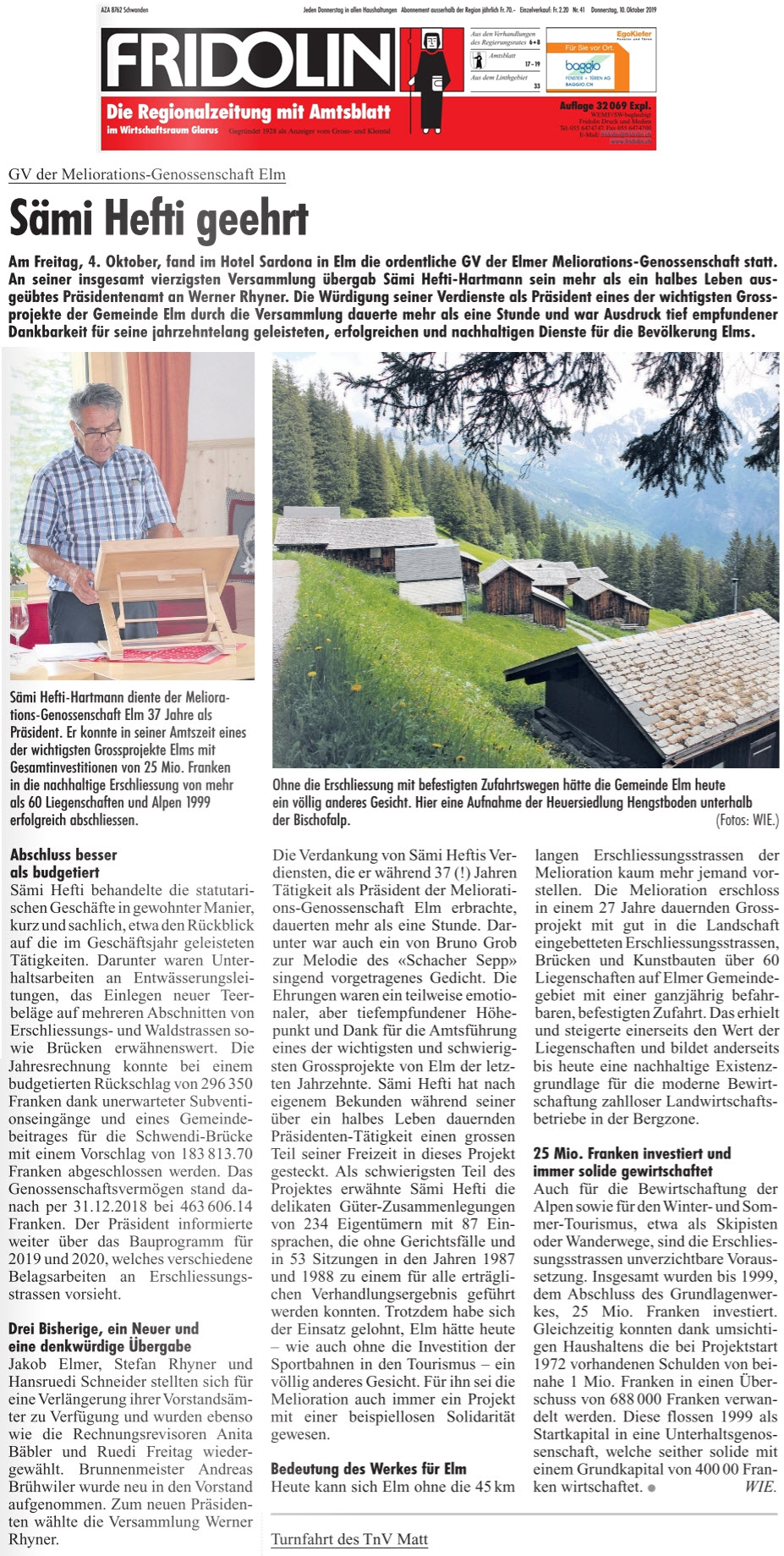 Ein halbes Leben lang hat Sämi Hefti als Präsident der Meliorationsgenossenschaft Elm gedient und entscheidend zum Gelingen dieses grossen Werkes beigetragen. Die Melioration erschloss u.a. 61 Wohnhäuser neu mit Zufahrtsstrassen und machte Alpen und Waldungen für Fahrzeuge zugänglich. Die Erschliessung der Sonnenseite von Elm - an der auch das Berghotel Bischofalp steht - ist heute eine der Existenz-Grundlagen für zahlreiche Elmer Familien. Am 5. Oktober 2019 berichtet die Südostschweiz / Glarner Nachrichten ausführlich in einem Bericht auf der Titelseite sowie einem Interview auf Seite 3 mit Sämi Hefti darüber.